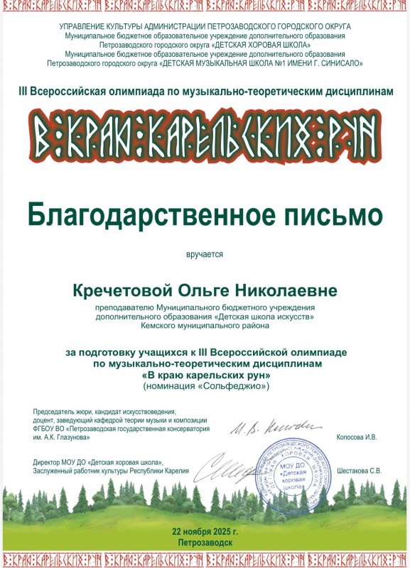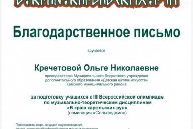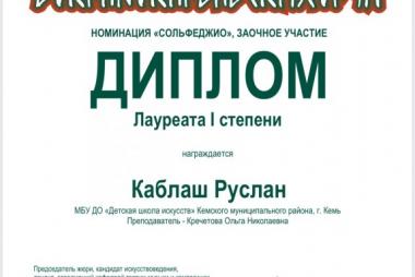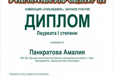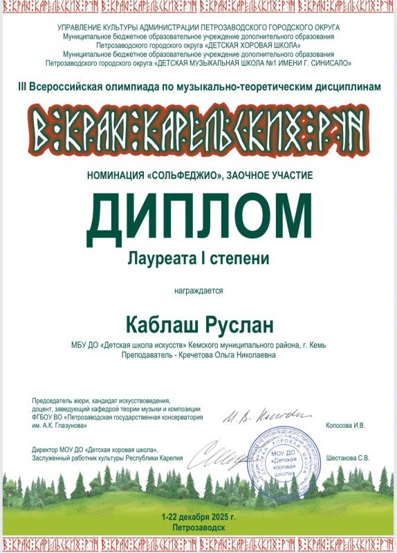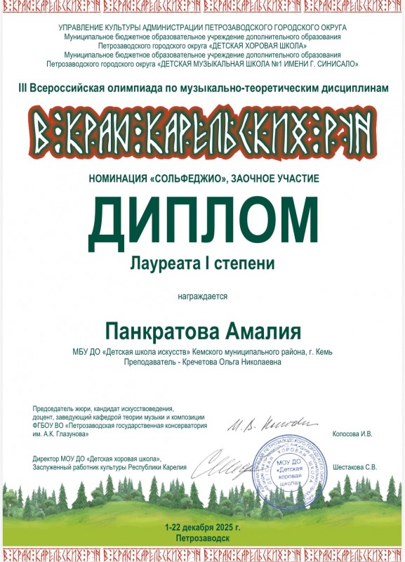 Панкратова Амалия - Диплом Лауреата I степени III Всероссийской олимпиады по музыкально-теоретическим дисциплинам «В краю карельских рун», номинация «Сольфеджио», заочное участие; Каблаш Руслан - Диплом Лауреата I степени III Всероссийской олимпиады по музыкально-теоретическим дисциплинам «В краю карельских рун», номинация «Сольфеджио», заочное участие. Преподаватель Заслуженный работник культуры РК Кречетова Ольга Николаевна.