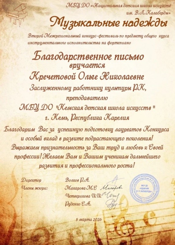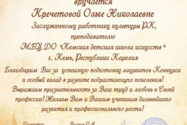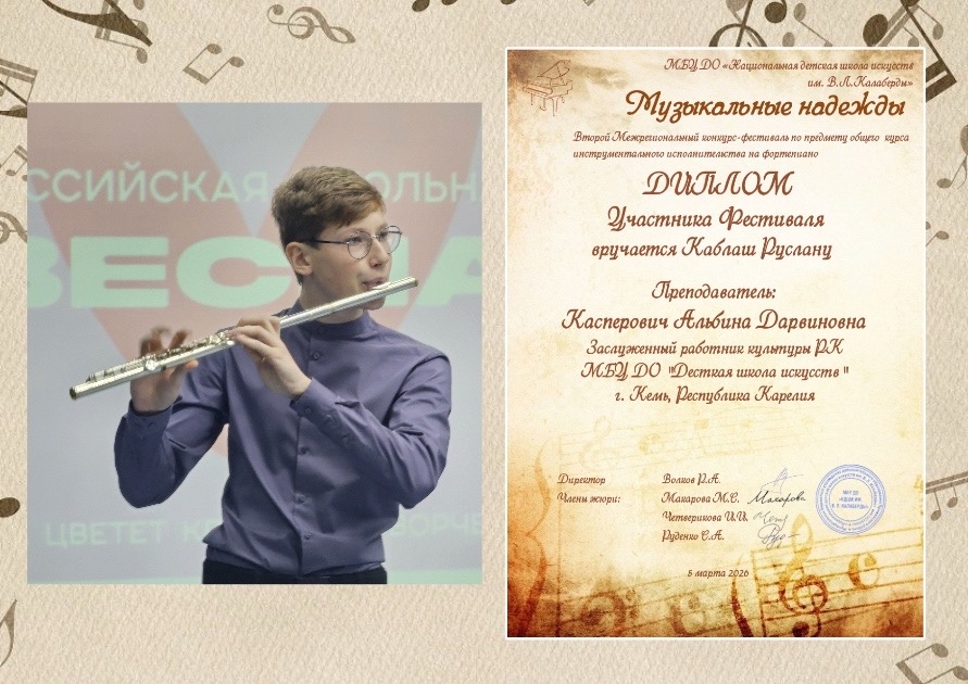 Преподаватель Заслуженный работник культуры РК Кречетова Ольга Николаевна Каблаш Руслан - Диплом участника фестиваля;