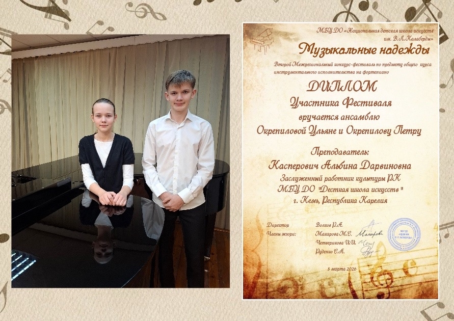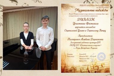 Ансамбль Окрепилова Ульяна и Окрепилов Петр - Диплом участника фестиваля.