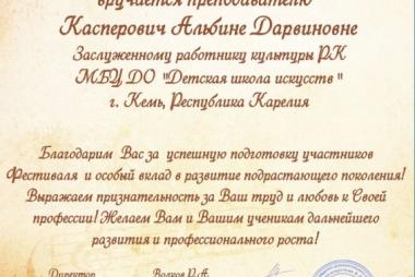 Преподаватель Заслуженный работник культуры РК Касперович Альбина Дарвиновна. Поздравляем ребят и преподавателей, желаем дальнейших творческих успехов.