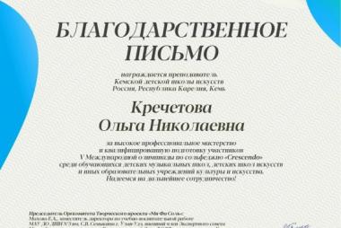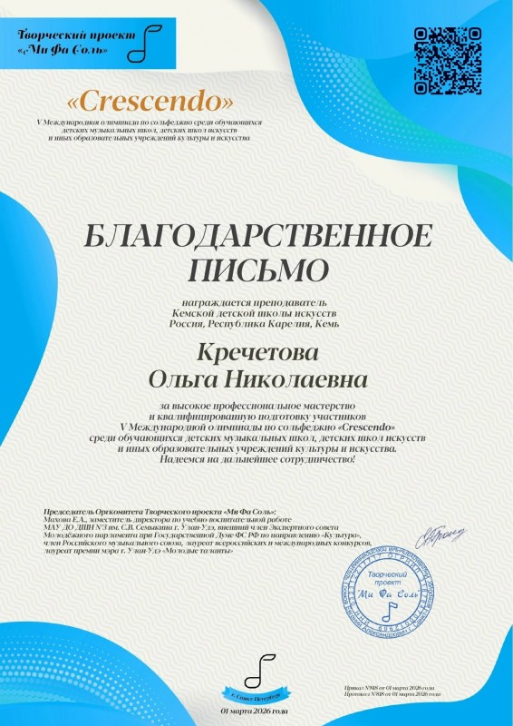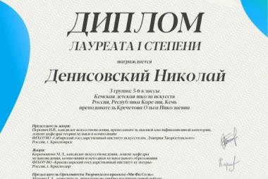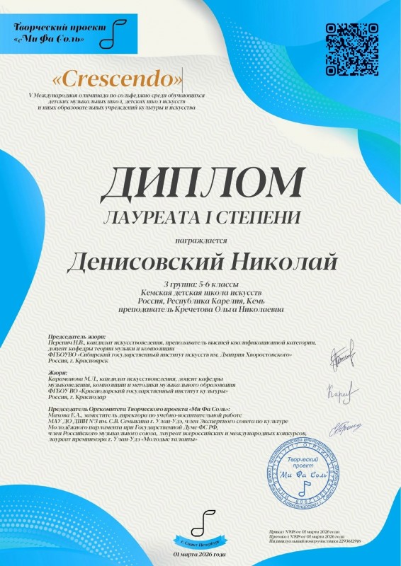 Поздравляем! Денисовский Николай - Лауреат I степени V Международной дистанционной олимпиады по сольфеджио "Crescendo", г. Санкт - Петербург. Преподаватель Заслуженный работник культуры РК Кречетова Ольга Николаевна.