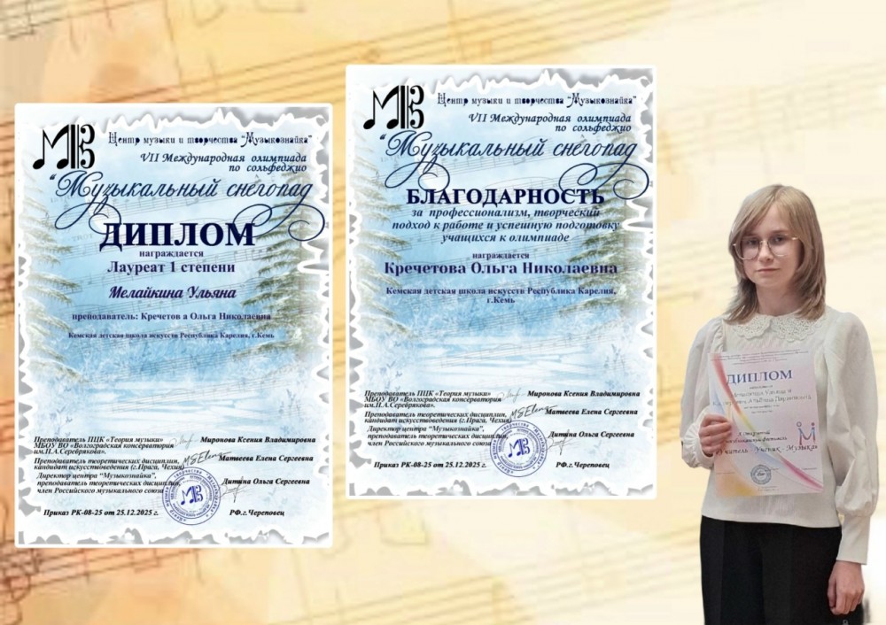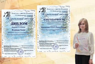 Мелайкина Ульяна - Диплом лауреата I степени VII Международной дистанционной олимпиады по сольфеджио «Музыкальный снегопад», г. Череповец;