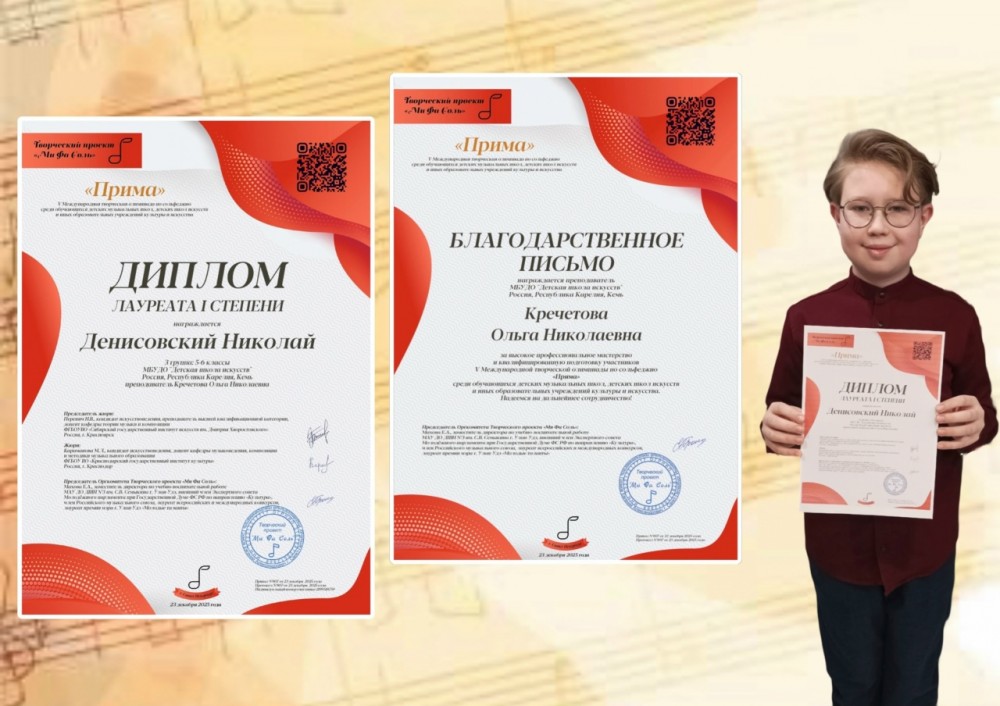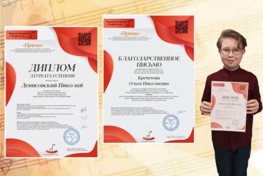 Денисовский Николай - Диплом лауреата I степени V Международной дистанционной творческий олимпиады по сольфеджио «Прима», г. Санкт-Петербург;