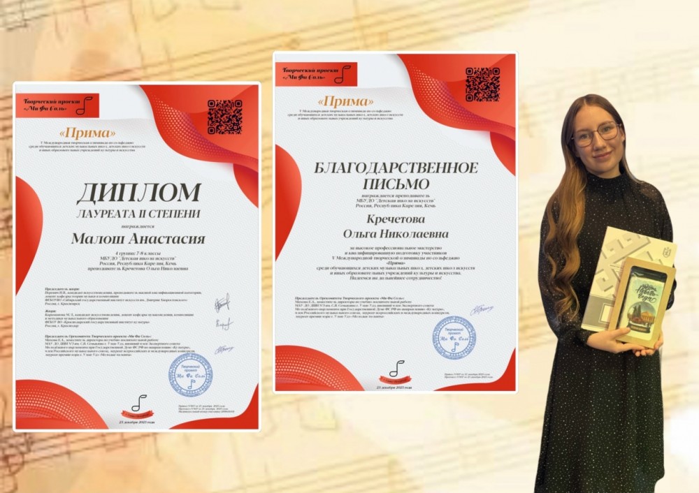 Малош Анастасия - Диплом лауреата II степени V Международной дистанционной творческий олимпиады по сольфеджио «Прима», г. Санкт-Петербург.