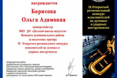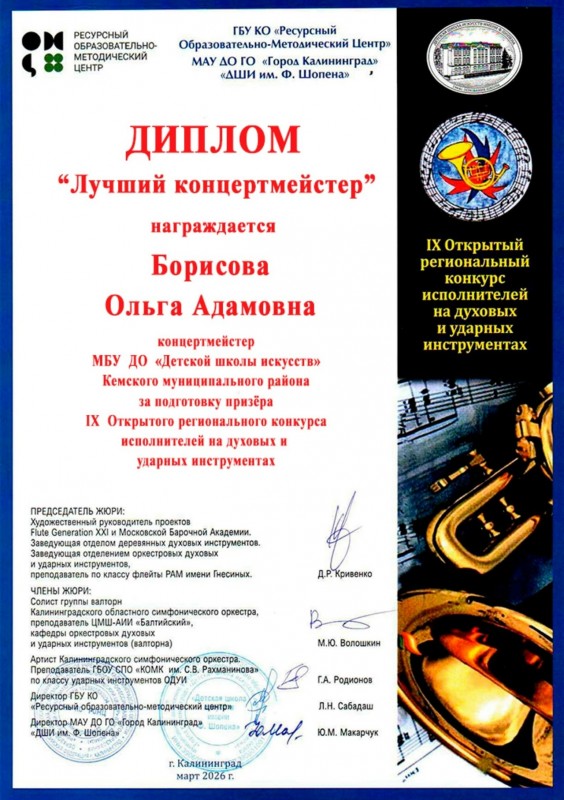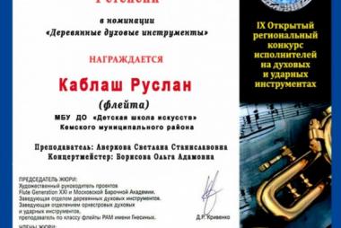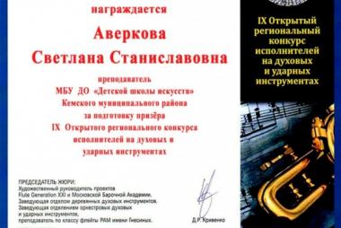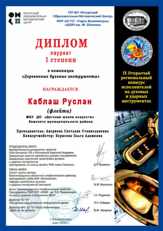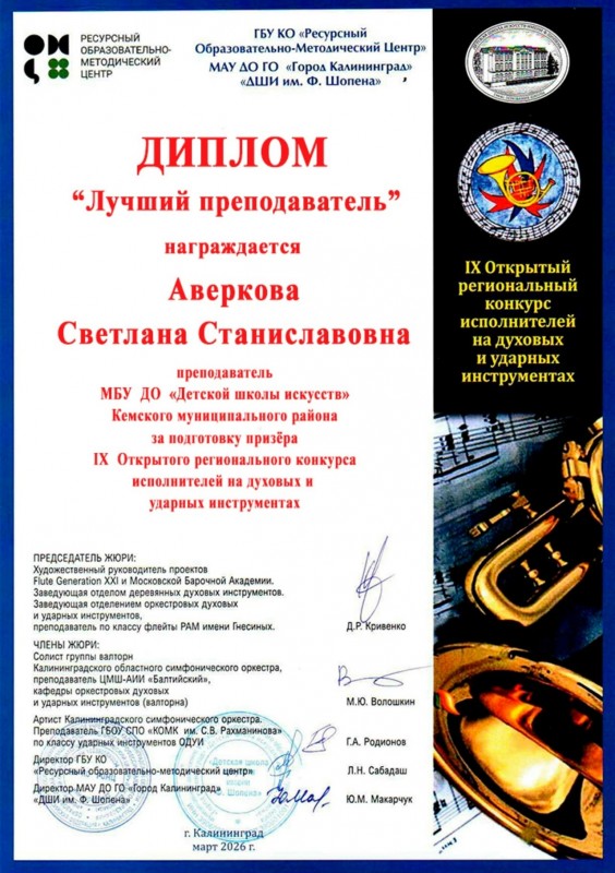 Кемскую Детскую школу искусств на конкурсе представил учащийся 7 класса духового отделения (класс флейты) Руслан Каблаш, преподаватель Аверкова Светлана Станиславовна, концертмейстер Борисова Ольга Адамовна. Руслан удостоен диплома Лауреата I степени. Преподаватели награждены Дипломами «Лучший преподаватель» и «Лучший концертмейстер». - Конкурс стимулирует творческий рост юных музыкантов, способствует обмену опытом между педагогами и помогает выявлять новые таланты. Поздравляем Руслана и преподавателей! Желаем дальнейших творческих успехов!