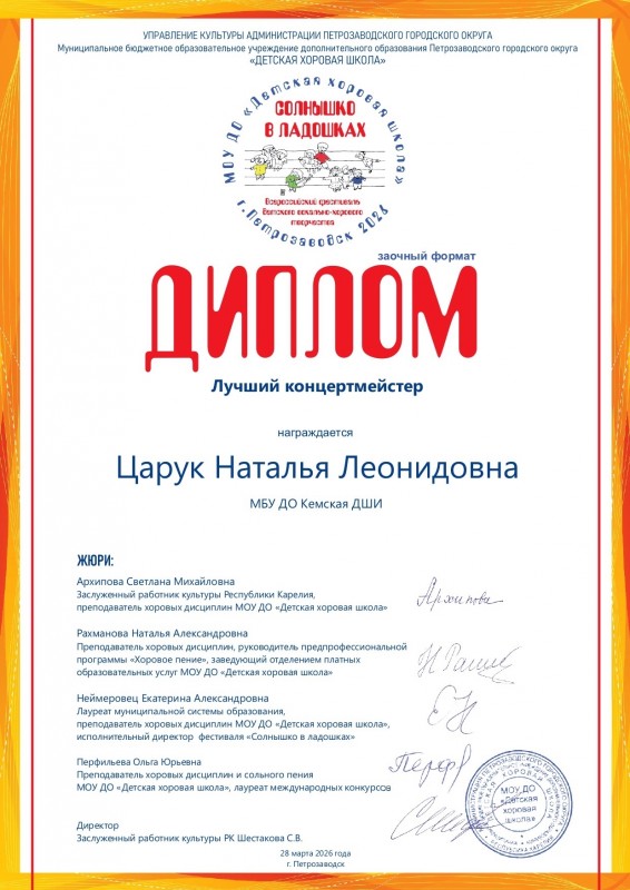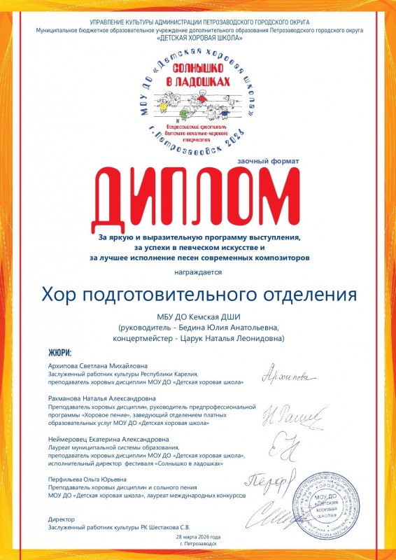 28 марта 2026 года в Детской хоровой школе Петрозаводска состоялся настоящий праздник детского вокально - хорового творчества. В этом году юбилейный X Всероссийский фестиваль «Солнышко в ладошках» прошёл в двух форматах: очном — для юных артистов из Петрозаводска; заочном — для участников из Карелии и других регионов России. В заочном формате приняли участие юные вокалисты, ансамбли и хоровые коллективы из республик: Карелия, Коми, Удмуртия; городов Липецк и Пермь; Воронежской, Ярославской, Архангельской и Московской областей.